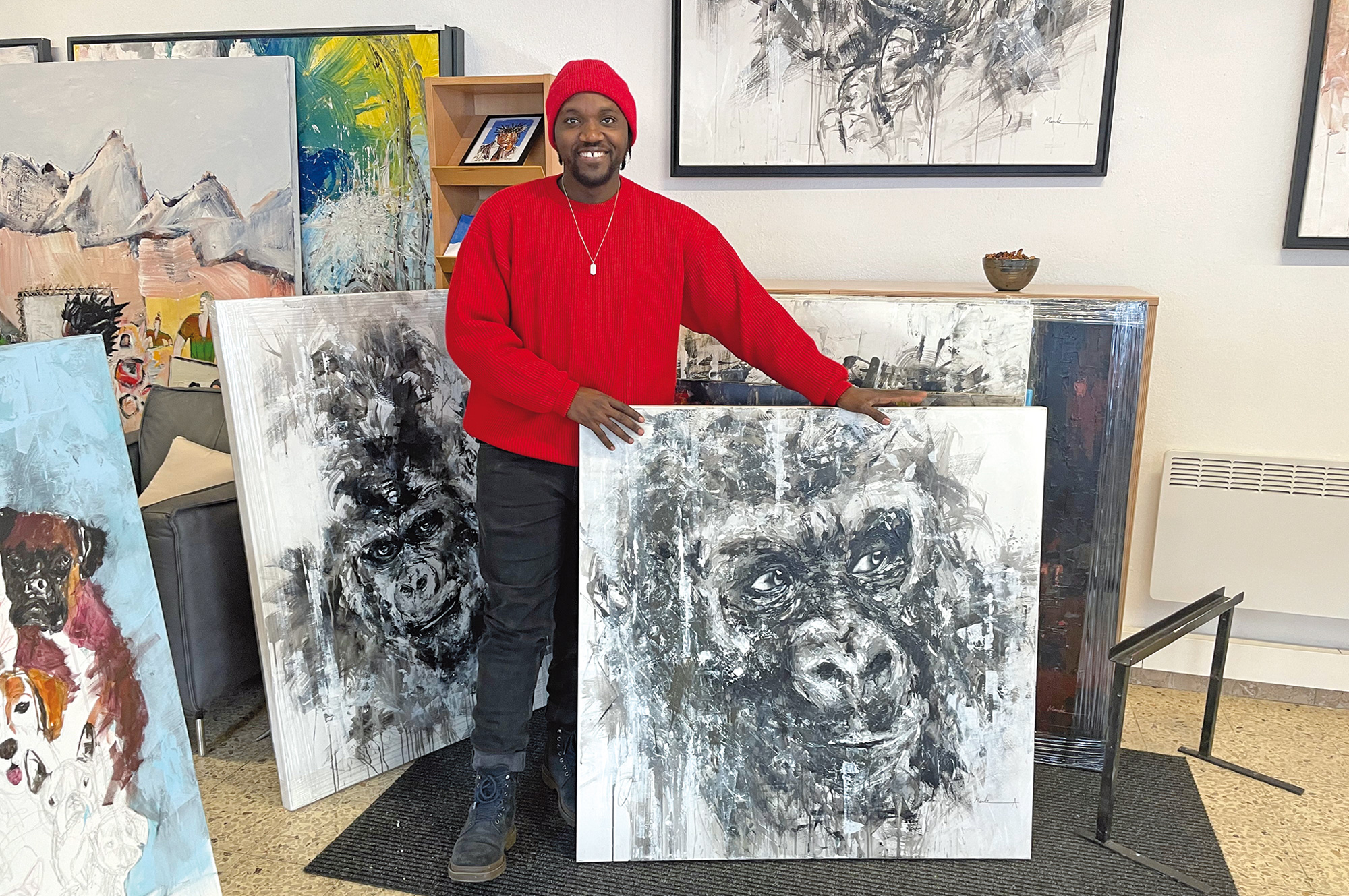 Mit dem Geld, das er mit den Bildchen verdiente, baut er an seiner Karriere. Er kauft Farbe und Leinwand, stellt Kontakte her und bekommt erste Einladungen zu Kunstmesse in ganz Afrika. Später folgen Einladungen in die USA, nach Großbritannien, Skandinavien, Holland. 2019 lädt man Mande zu einem Symposium nach Wien ein: „Das war die beste Zeit meines Lebens. Einige Monate lang konnte ich einfach nur Malen, ohne Zwang und Auflagen“, schwärmt Mande. Damals entstehen etliche Kunstwerke, aber noch mehr Freundschaften. Im Februar 2020 kommt er erneut nach Wien, um in Galerien seine Werke zu präsentieren. Und auch, um sich den Winter bei uns anzusehen, um das Weiß in seine Kunstwerke aufzunehmen, um neue Inspirationen zu finden. Und dann kommt Corona: Mande sitzt in Österreich fest. Zum Glück kommt er bei einer Gastfamilie unter.